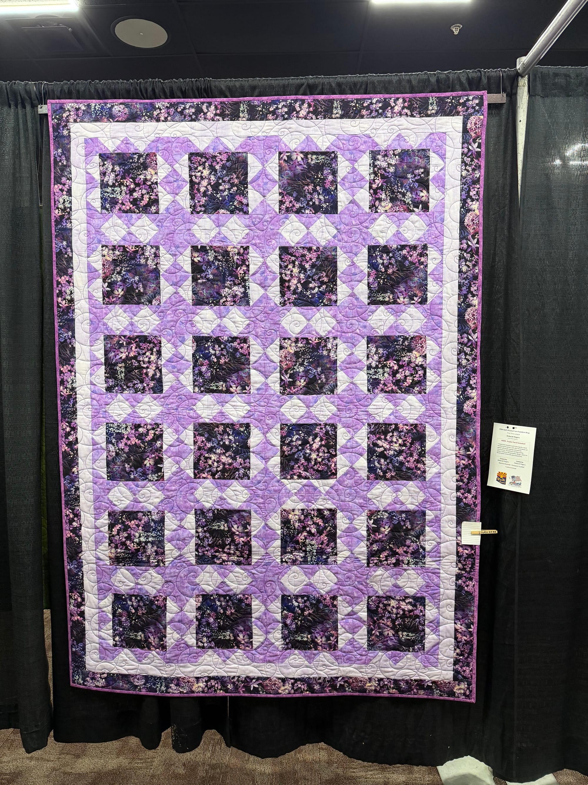 The quilt features a grid of richly detailed floral blocks in deep purples and blacks, set against soft lavender and crisp white interlocking shapes that create movement and contrast across the surface. The composition feels balanced and inviting, with the darker prints drawing the eye while the lighter elements provide space for the design to breathe.