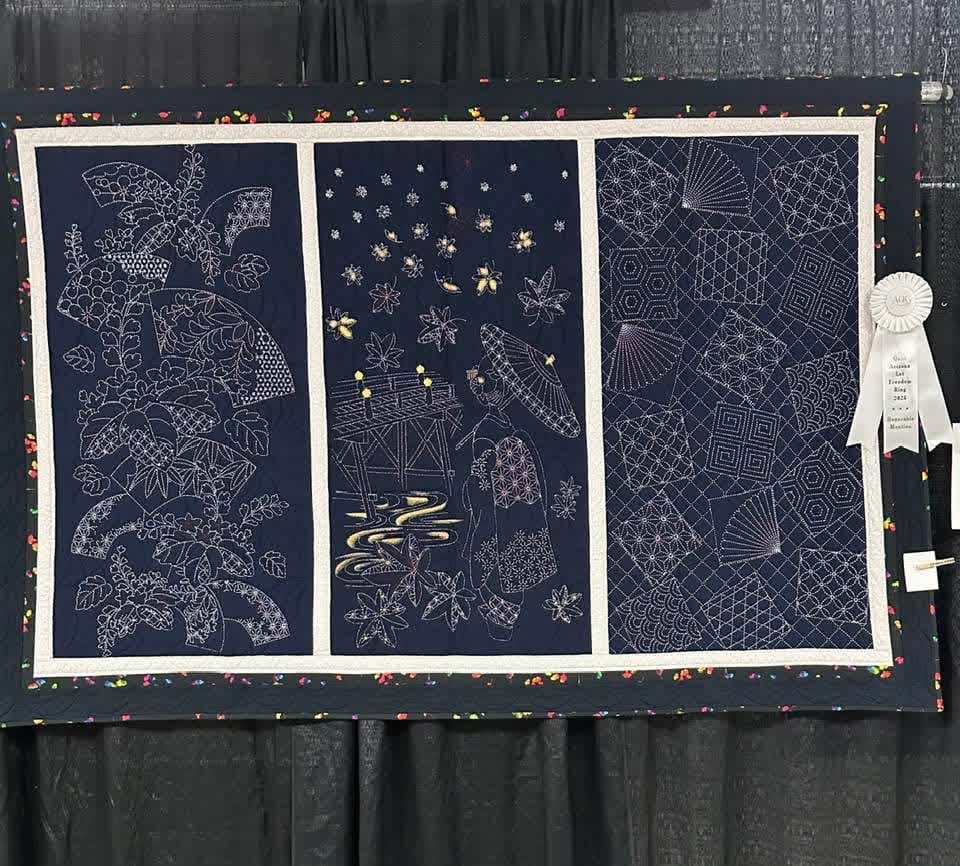 Crisp white sashing frames each section, allowing the detailed stitching to shine against the rich navy fabric. Ellen Yacovone’s work beautifully balances storytelling, nature, and geometry—demonstrating how thread alone can create depth, movement, and emotion.