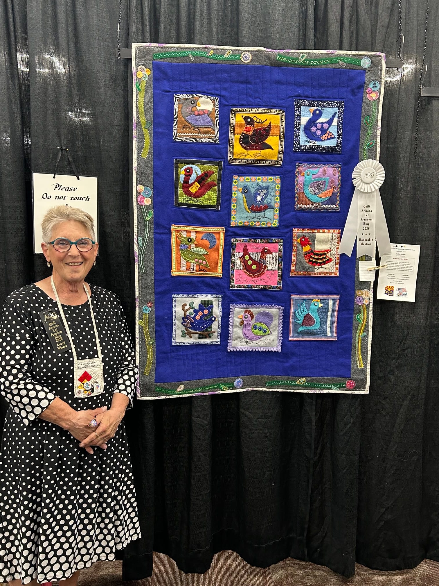 Standing proudly beside her award-winning quilt, Patty Hacker presents a delightful celebration of color, texture, and whimsy. Set against a rich cobalt blue background, the quilt features a collection of twelve intricately designed bird blocks, each one uniquely embellished with playful fabrics, embroidery, and dimensional details.